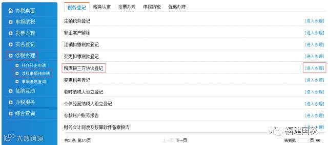 登录福建国税电子税务局,点击左侧“涉税办理”中的“涉税办理事项”菜单,再点击“税库银三方协议登记”后[进入办理]按钮,进入三方协议办理页面。菜单位置如下图: