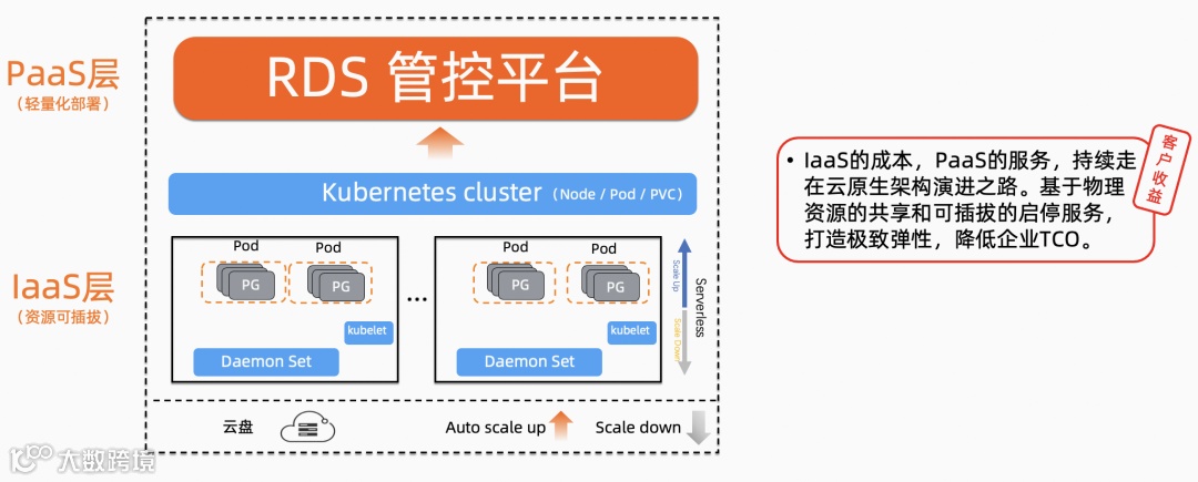 ● 全面云原生化使得RDS PostgreSQL可以帮助SaaS厂商降本增效,进而实现单租户成本下降。例如,存储PL等级可以降配,存储可以缩容,可以设置应用无感的自动扩容,无需提前扩容较大的容量,并能降低磁盘打满锁定的风险,节省财务成本和人工维护成本。计算资源支持服务暂停,Serverless形态也蓄势待发,咬合业务流量,真正做到自来水式按量付费。