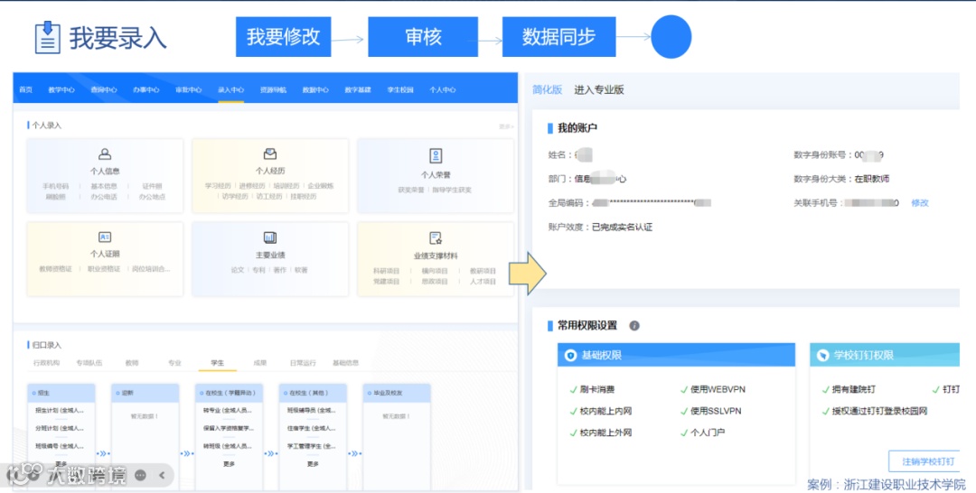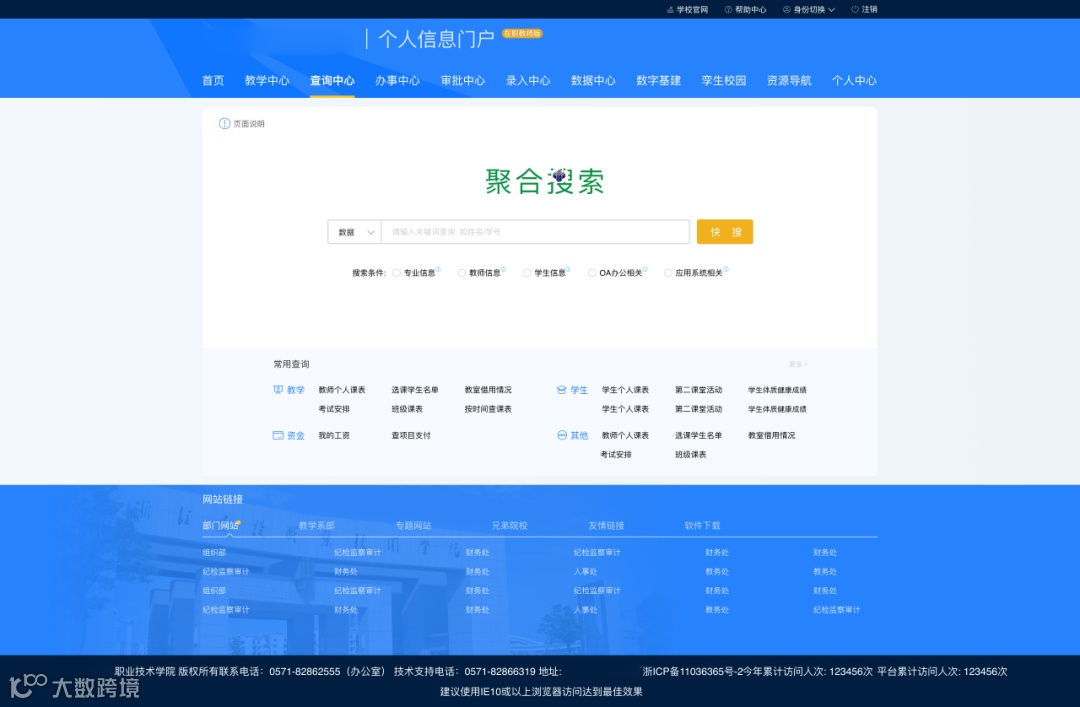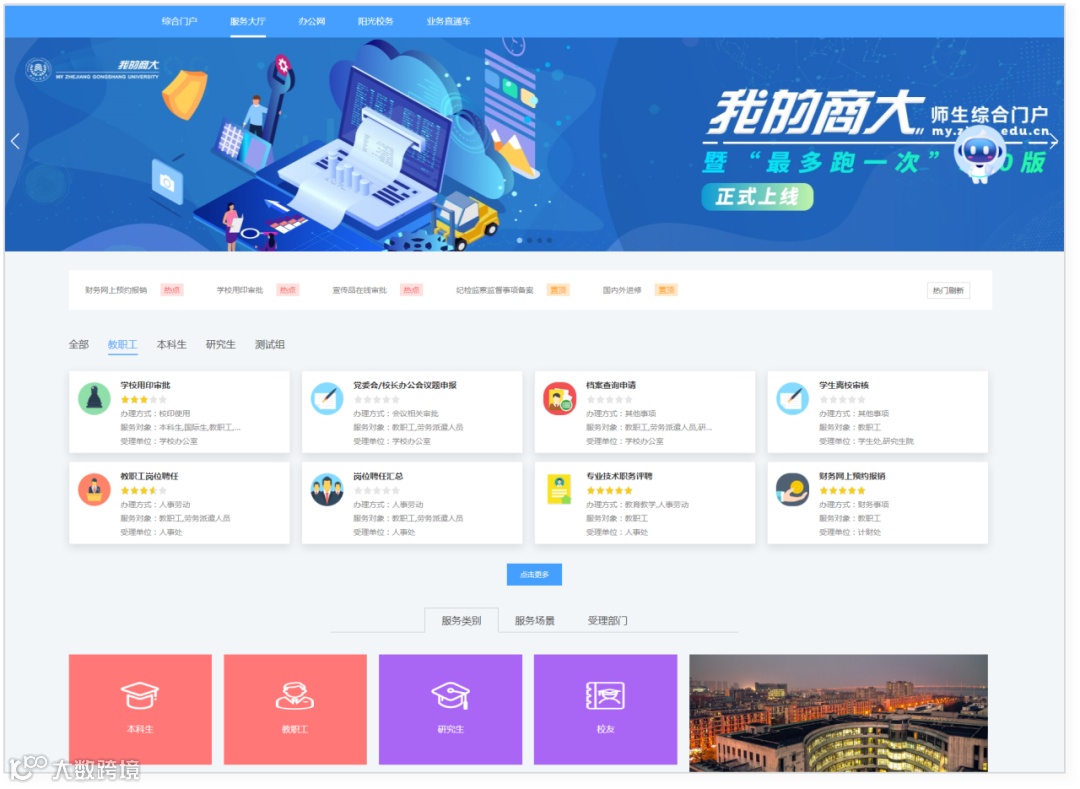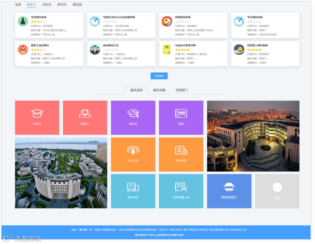 例如,入口多、系统多、流程多,信息服务查找办理不够便捷、智能化和人性化;数据展示不统一/断层,从学生角度,很难在一个平台中全面查看个人从招生到毕业的全周期数据,从教师角度,很难查看到涵盖自己教学、学工、科研、人事等的全方位数据。