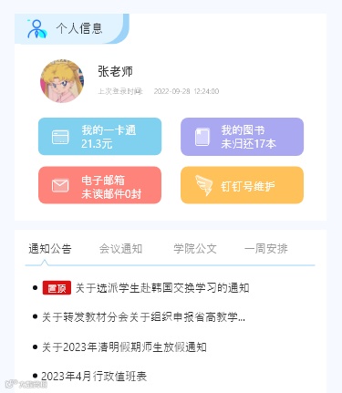 根据不同用户角色的关注点和使用习惯,采用扁平化风格设计搭建个人数据、事务、消息全覆盖、内容可定制的个人中心。通过我要查、我要办、我要审、我要录入、我要评价、我要统计导航卡片一键直达,直观展示个人数据全覆盖、服务全覆盖、消息全覆盖、资讯全覆盖的个人门户,提升师生用户体验和获得感。