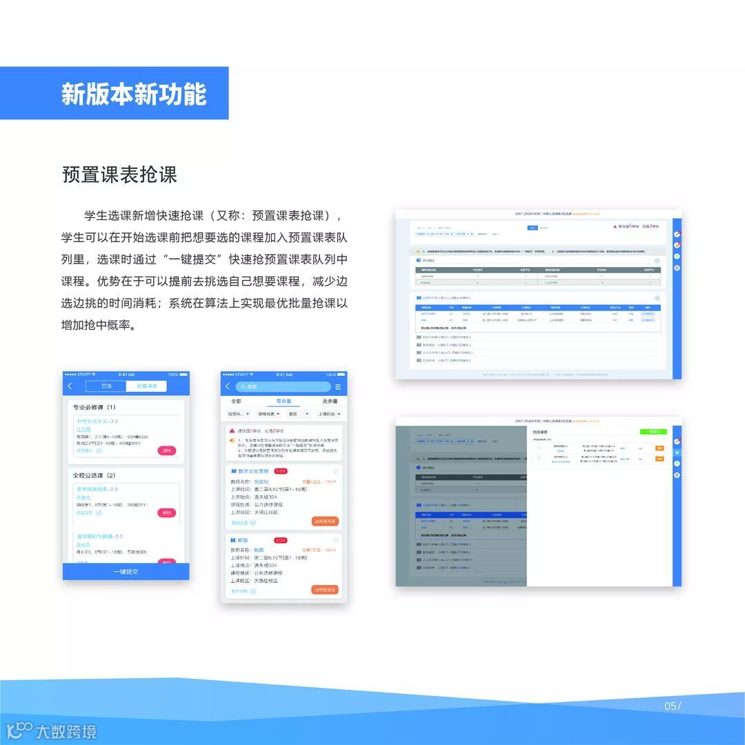 学生选课新增快速抢课(又称:预置课表抢课),学生可以在开始选课前把想要的课程加入预置课表队列里,选课通过"一键提交"快速抢预置课表队列中课程。优势在于可以提前去挑选自己想要课程,减少边选边挑的时间消耗;系统在算法上实现最优批量抢课以增加抢中概率。