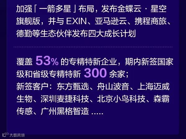报告期内,小微企业财务云服务业务继续保持快速增长,收入同比增长74.1%,其中金蝶云·星辰收入同比增长337.7%,续费率72%,客户数近20,000家。金蝶云·星辰定位满足成长期的小型商贸及工贸企业,持续完善解决方案,助力企业“管理+经营”一体化升级,帮助企业实现财税管理智能化、客户经营数智化、线上线下一体化和产供销协同一体化,重新定义了业财税一体化升级的标准。通过产品的不断创新与营销推广,小微企业生态伙伴布局日益完善,金蝶在小微企业市场的占有率进一步提升。