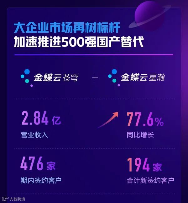 报告期内,金蝶云·苍穹和金蝶云·星瀚合计录得收入约人民币2.84亿元,同比增长77.6%,续费率较去年同比保持稳定;期内签约客户476家,新签客户194家,包括山东重工、中国通用集团、五矿国际、金地集团、柳工集团、广东能源、重庆医药等超大型和大型企业。此外,公司继续引入战略级交付伙伴,实现交付直签突破,支撑公司全面进攻大企业市场战略。过去两年,苍穹和星瀚已经累计帮助122家企业完成国产化替代,助力华为、万科、招商局、物产中大、河钢集团、沙钢集团等众多世界500强进行数字化管理重构。
