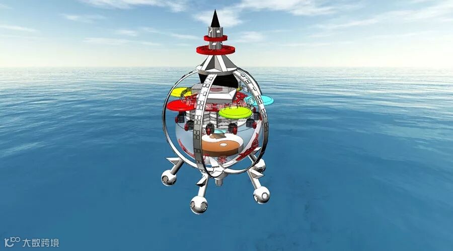 该作品由3D One设计完成,整个船身可以分为三大部分——种植区、居住区和游乐区,其中种植区外面通过材质渲染为玻璃的效果,吸收阳光让农作物们加倍生长;居住区通过阵列命令堆积而成,可供上千人居住;游乐区有五花八门的玩耍用具,通过实体和切割结合建模实现。