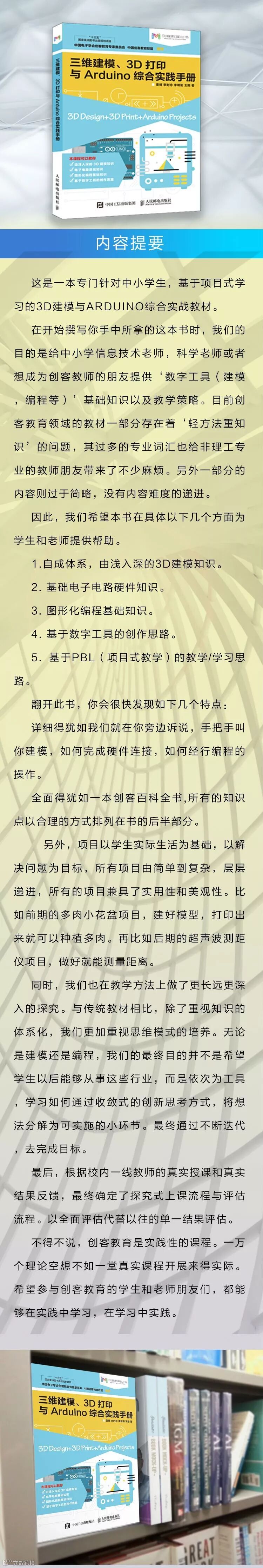 3D One创新书籍栏目【3D One青少年创新丛书】开栏啦,每周五为大家推荐3D One创新好书,供大家阅读~本期要介绍的是来由董博、李明阳、李时念等老师编写的《三维建模、3D打印与Arduino综合实践手册》。