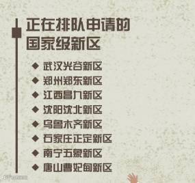 据记者了解,目前,除了上述获批的15个国家级新区外,全国至少还有8个城市提出要打造国家级新区,分别是:武汉光谷新区、郑州郑东新区、江西昌九新区、沈阳沈北新区、乌鲁木齐新区、石家庄正定新区、南宁五象新区以及唐山曹妃甸新区。