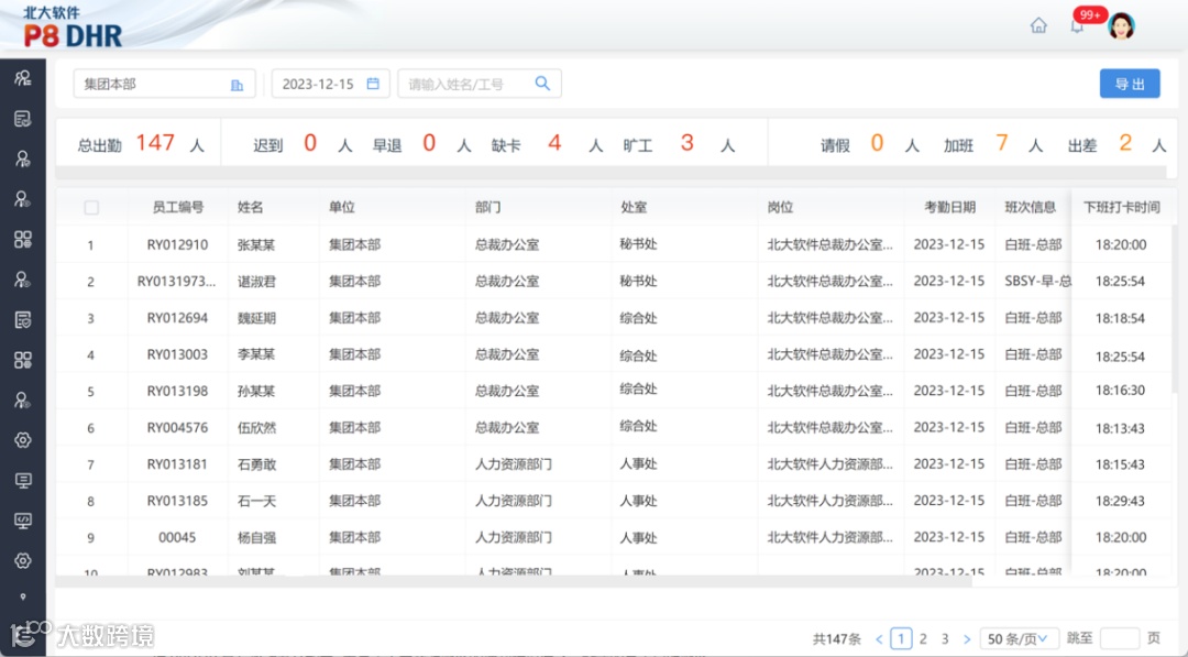 北大软件P8DHR假勤管理提供集团管控能力、可灵活配置考勤规则、助力假期管理合规合法、数据串联上通下达、报表多样全程留痕、自助服务全员参与,满足央国企多业态、多行业、多类型员工等相互交织的复杂业务场景的考勤管理,将人力从大量的重复性工作中解放出来,从事更有价值的工作。