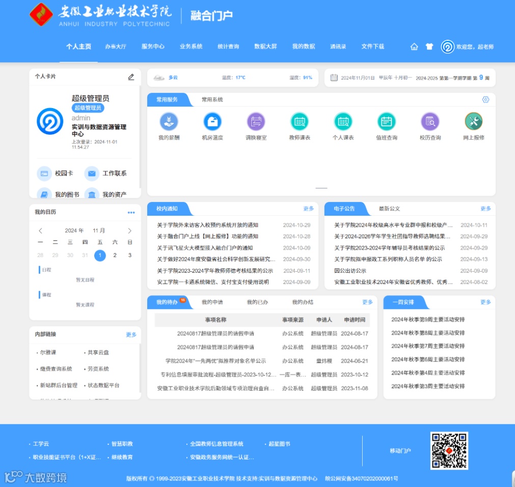 在中华民族青铜文明发祥地、中国古铜都铜陵市,坐落着一所以现代制造、电子信息、资源开发和财经管理四大专业为特色的高等职业教育学校——安徽工业职业技术学院(简称“安工学院”)。学校积极落实教育部《教育信息化2.0行动计划》、《高等学校数字校园建设规范(试行)》等政策,不断推进内部治理体系改革,“主动作为、聚焦内涵、突出特色、改革创新”,努力提高学校的整体水平,朝着建设信息特色鲜明的高等院校大步迈进!
