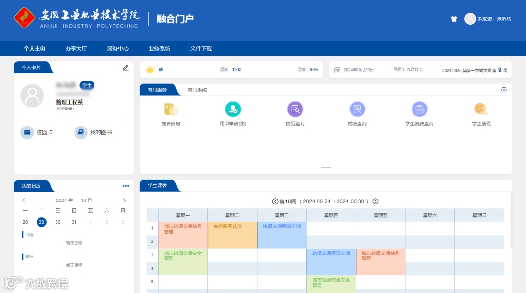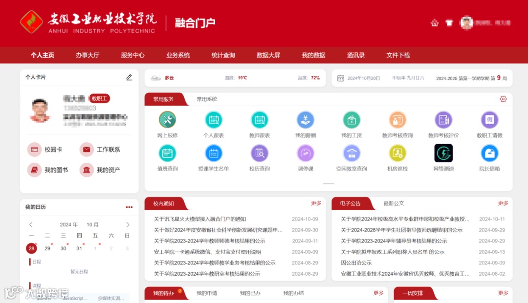 学校智慧融合门户平台采用扁平化风格设计搭建个人数据、公告、服务、待办等模块,支持用户根据个人习惯定制个人中心。平台通过办事大厅、服务中心、业务系统、统计查询、数据大屏等模块,直观展示个人数据全覆盖、服务全覆盖、消息全覆盖、资讯全覆盖,极大提升师生用户体验和获得感。结合人工智能技术,该平台已成功集成AI智能问答系统,这一创新功能显著丰富了平台的服务范围,使其能够全面满足学术探讨、生活咨询、工作辅助、信息检索及数据分析等多方面的需求,为师生用户提供一站式综合解决方案。