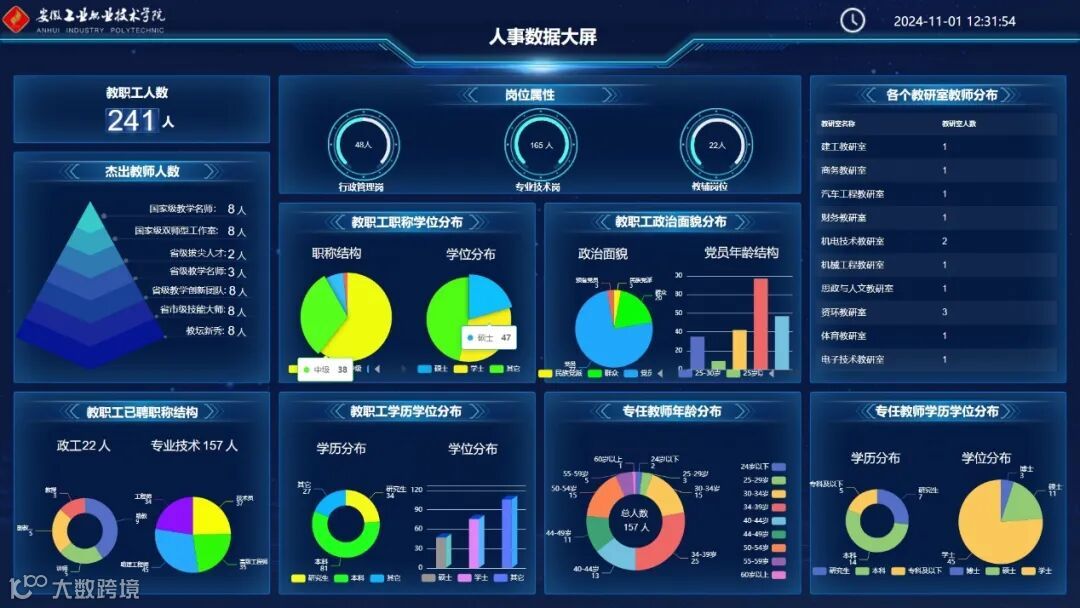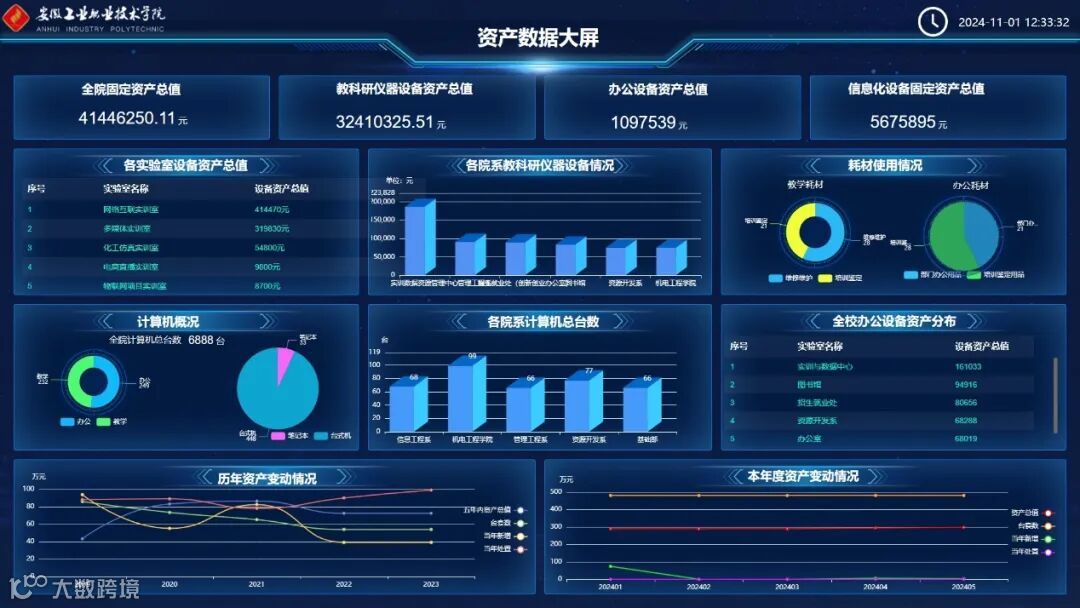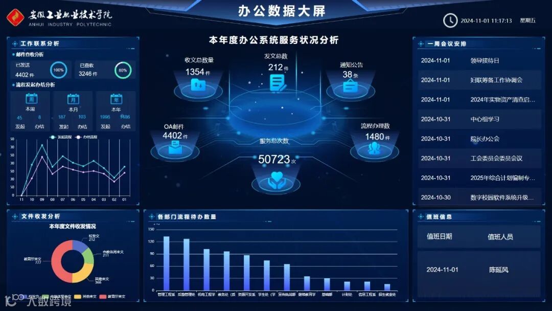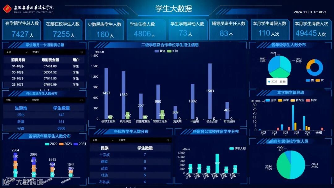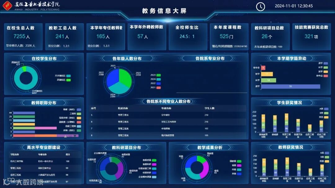 目前,学校已形成《安徽工业职业技术学院核心数据编码标准》。基于统一标准,数据治理平台已集成47个数据源,采集学校12个部门、79个数据子类、821个数据项、1560万条数据,基本实现各系统数据自动化采集、数据实时同步。建成以公共数据库为核心的数据交换监控和共享交换机制,创建238条数据交换共享任务,形成校情总览、教务大屏等8大业务部门数据大屏,以及基本完成高职数据上报要求。