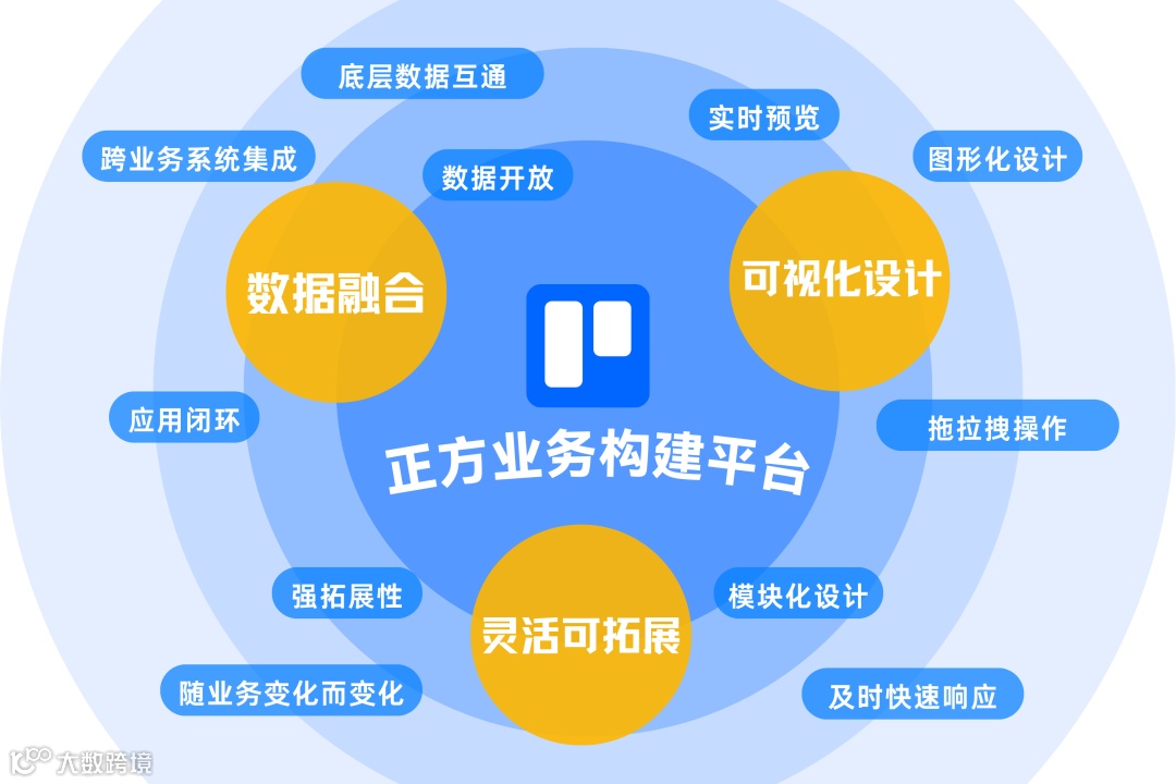 正方业务构建平台支持全面的跨业务系统数据集成、数据开放能力,实现底层数据互通,支持用户在一个平台上进行不同业务部门应用的构建、运行、维护,解决各类轻应用的闭环管理。通过与数据中心、办公、人事等内外部业务系统的数据互通,方便快速扩展应用。