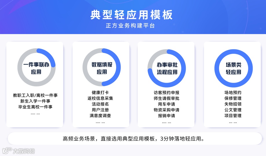 基于多年高校教育服务领域的经验,正方业务构建平台融合一网通办,无缝衔接人事、办公、教务、学工、科研等业务系统,减轻信息技术中心压力,赋能全校业务部门,实现师生办事方式多元化、办事流程最优化、办事材料最简化、办事成本最小化。平台已在四川大学华西医院、重庆工商大学、三亚航空旅游职业学院等二十余所高校投入使用。