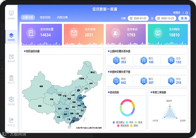 信访数据一屏通提供准确、全面的数据支撑,能够切实满足信访局领导向上一级汇报工作时的筹备要求,实现领导随时查询所管辖区域整体信访情况的治理目标,加快推进信访工作的规划与实施。