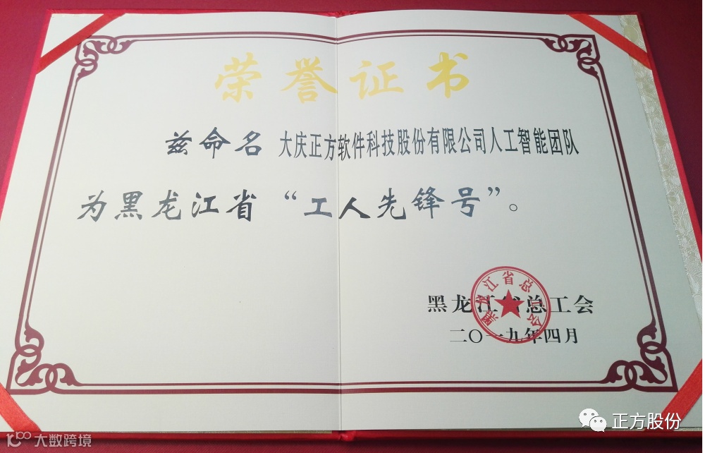“大庆正方软件科技股份有限公司人工智能团队”被黑龙江省总工会授予“工人先锋号”荣誉称号。