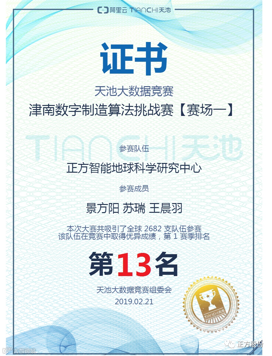 正方集团以景方阳、苏瑞、王晨羽为代表的核心技术团队,在2019年2月参加了阿里巴巴组织的天池大数据竞赛“津南数字制造算法挑战赛”,从全球2682支参赛队伍中脱颖而出,获得第1赛季第13名的优异成绩。