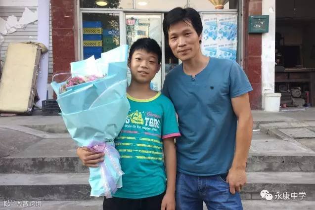 凯旋的周景浩同学和爸爸在自家门前开心合影