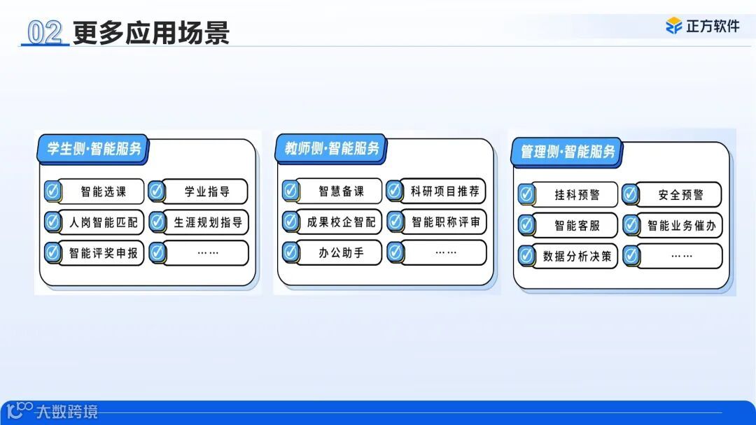 基于人工智能技术对教育数字化影响深远的背景,本次培训中特别新增《构建智慧校园+AI,赋能高校教育高质量发展》和《AI 智能体“正方通”的探索与实践》主题报告。自今年4月校园AI助手“正方通”发布以来,“正方通”能力不断成熟,从智能问答拓展至学生从入学到毕业的生涯陪伴,到教师科研、办公事项处理的流程自动化,再到管理侧校园治理、学生工作、教育教学各类业务的预警模型落地,AI+教育教学、AI+学生工作、AI+教师发展、AI+校园治理等应用场景正在逐步实现。