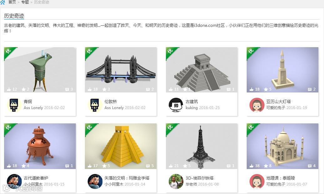 古老的建筑、失落的文明、伟大的工程、神奇的发明......一起创造了昨天、今天、和明天的历史奇迹。这里是i3done.com社区,小伙伴们正在用他们的三维创意描绘历史奇迹的光辉!