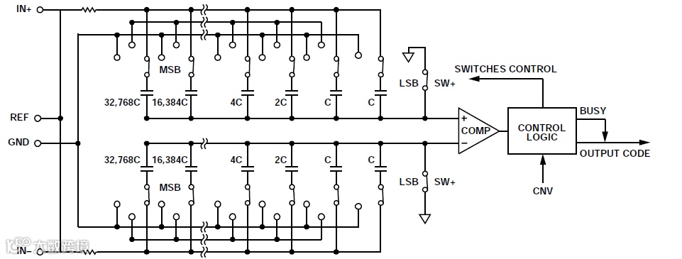 逐次逼近算法通过逐步逼近的方式确定每个数字位的值。容性DAC包含两个完全相同的16位二进制加权电容阵列,分别连接到比较器的两个输入端。