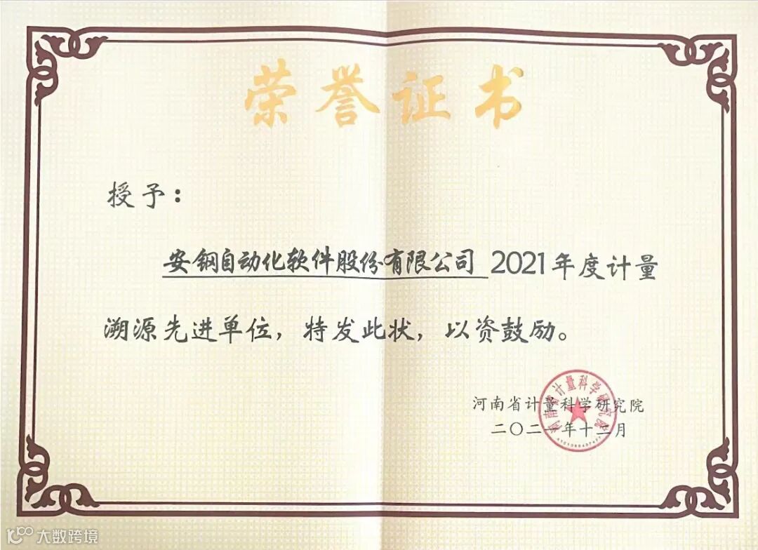 安钢软件荣获河南省2021年度“计量溯源先进单位“