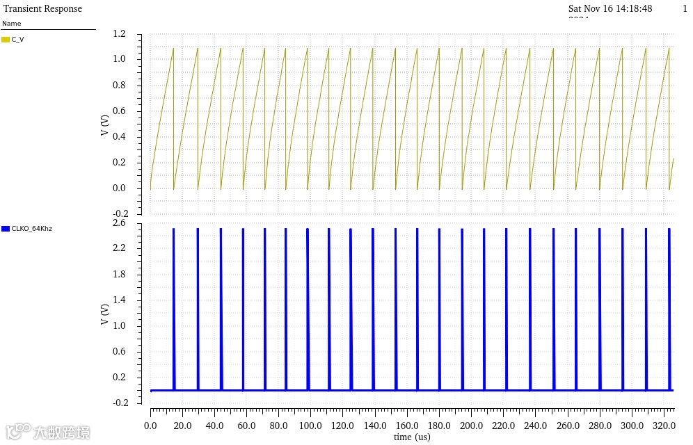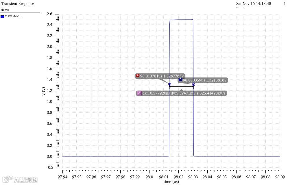 图19为频率随时间的变化关系。可以看出初始时刻频率不稳定,而时钟检测模块会让振荡器起振若干个周期后再输出,正好将频率不稳定的区间过滤掉,从而保证了频率的稳定。