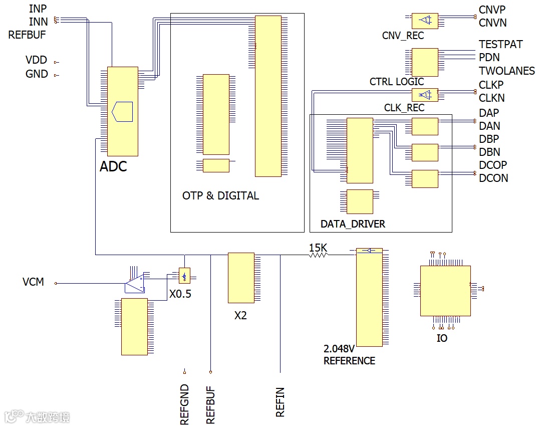 从上图可以看到,LTC2387-18包含一个精密的2.048V参考电压源,还配备一个内部参考缓冲器,为模数转换提供稳定的参考电压。我们在整理后的电路图中也可以看到该模块的位置。