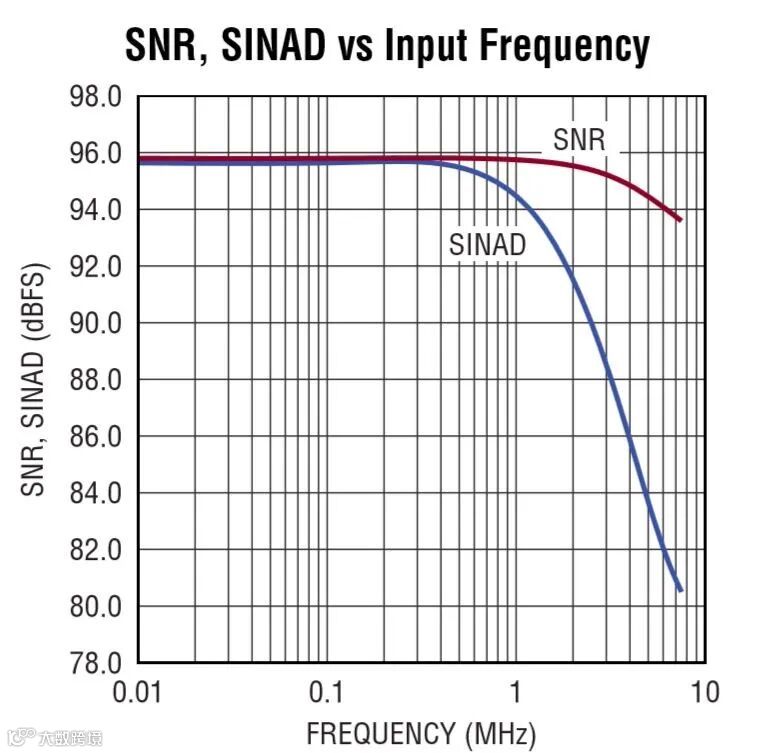 18 位高分辨率和15Msps高采样速率的完美结合,共同提高着转换准确性和转换精度。该芯片的无延迟操作可以提高系统的控制精度和稳定性。在1MHz输入频率下,LTC2387-18具有95.7dB的信噪比(SNR),高线性度与低噪声保证了信号的纯净度。下图给出了信噪比的典型特征图。