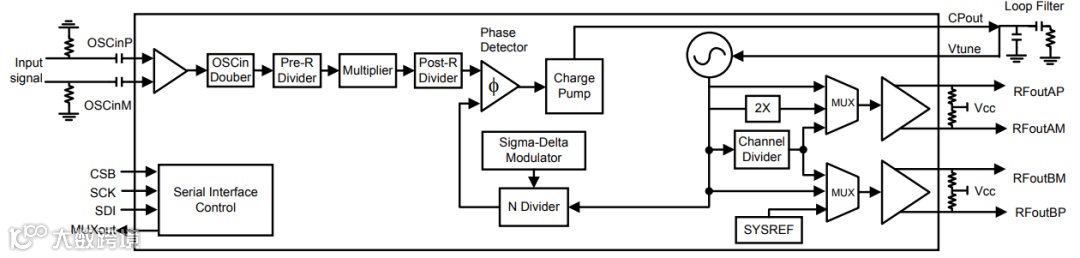 PLL集成了最高可达4阶可编程Δ-Σ调制器的分数N-PLL。分数分母为可编程的32位长,可轻松提供低于1Hz分辨率的精细频率步进,或用于精确分数,如1/3、7/1000等。在分数模式下,鉴相器的频率可达300 MHz,在整数模式下,频率可达400 MHz,但也必须考虑到N分频器的最小值。