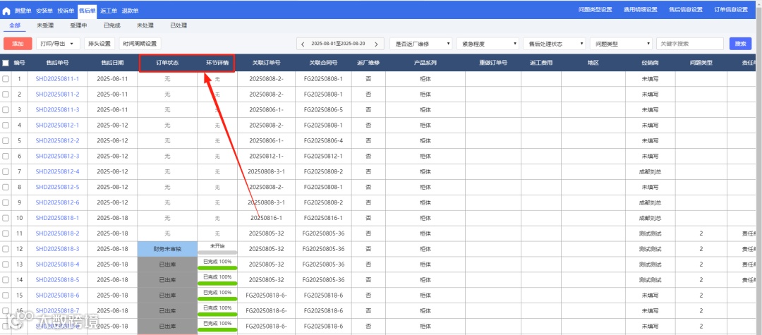 (2)售后单-全部中新增排头:订单状态和环节详情(非其他下单中新增的售后单,环节详情和订单状态显示为【无】)