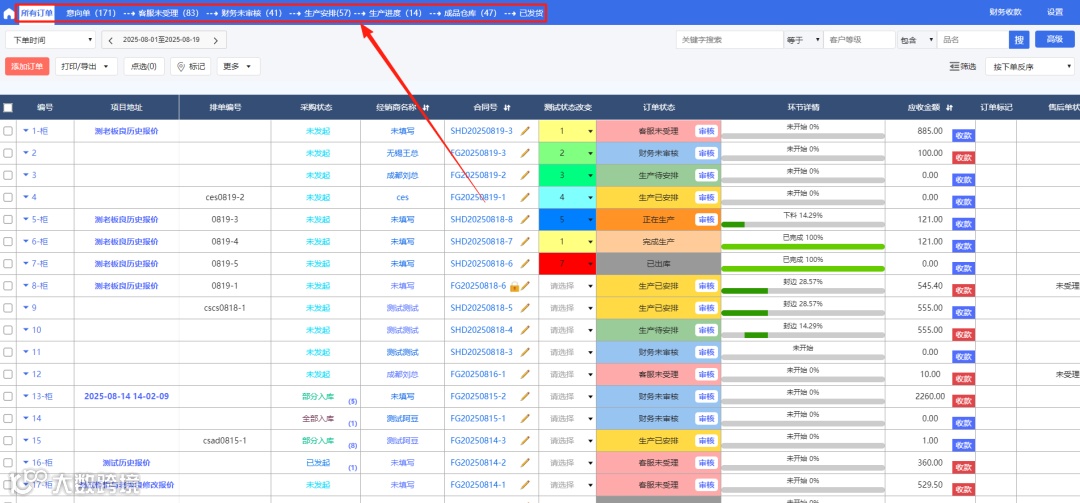 所有订单、意向单、客服未受理、财务未审核、生产安排、生产进度、成品仓库、已发货的筛选区域的最左侧均增加合同类型的筛选