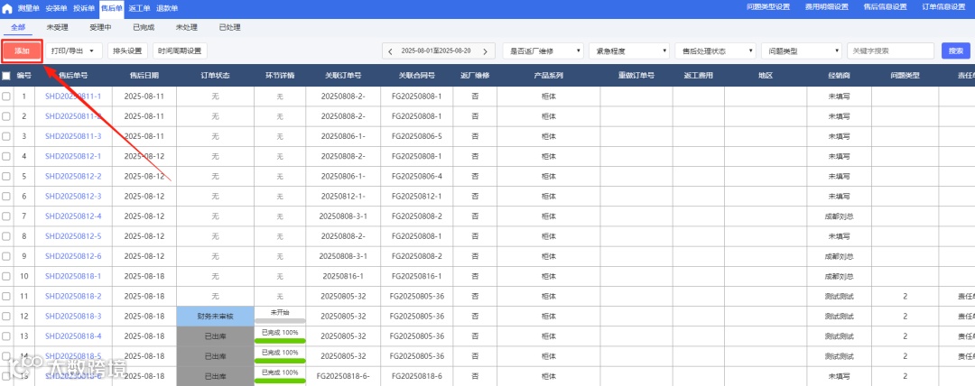 参数关闭后,其他下单页面与 柜体订单的订单详情内右边新增的添加售后单按钮隐藏,不可添加售后单