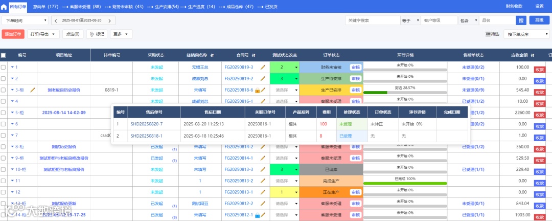 (2)正单的【售后单状态】:若存在售后单,则显示售后单状态以及当前状态的售后单数量(例如:正单的售后单有2个,一个为未处理,一个为已处理,则显示为已处理(1/2),并蓝字显示,点击可弹出售后单详情,售后单详情排头:编号、售后单号、售后日期、关联订单号、产品系列、费用、处理状态、订单状态、环节详情、完成日期)