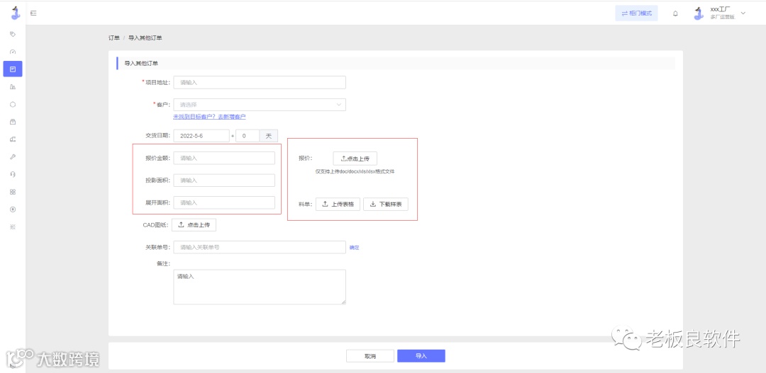 1、增加投影面积、展开面积、订单金额手动输入框。