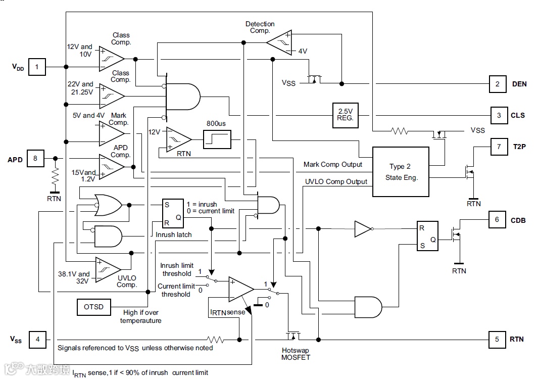TPS2378芯片是德州仪器(TI)设计的一款符合IEEE802.3at标准的高功率受电设备(PD)控制器。TPS2378符合IEEE802.3at Type 2 PD标准,支持802.3at Type 1 (802.3af) 和802.3at Type 2。该控制器具有较低的内部开关电阻,低至0.5Ω,这有助于减少功率损耗并提高效率。采用耐热增强型PowerPAD™封装,使得控制器能够长时间在高达0.85A的电流下运行。TPS2378具有辅助电源检测APD输入,可以优先连接外部电源适配器,提供更灵活的电源管理。该芯片具有100V导通晶体管,能够处理较高的电压,提高了电路的安全性和可靠性。