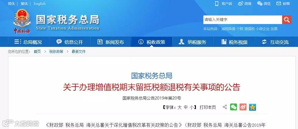 《财政部 税务总局 海关总署关于深化增值税改革有关政策的公告》(财政部 税务总局 海关总署公告2019年第39号)出台后,税务总局制发了《国家税务总局关于办理增值税期末留抵税额退税有关事项的公告》(国家税务总局公告2019年第20号),就留抵退税政策实施过程中涉及的相关征管事项进一步予以明确。