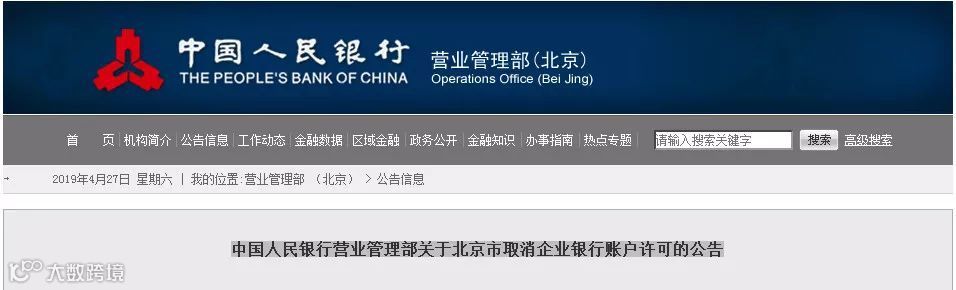 中国人民银行营业管理部关于北京市取消企业银行账户许可的公告