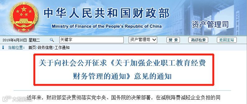 财政部公布了《关于加强企业职工教育经费财务管理的通知(征求意见稿)》(以下称《通知》),并向社会征求意见。