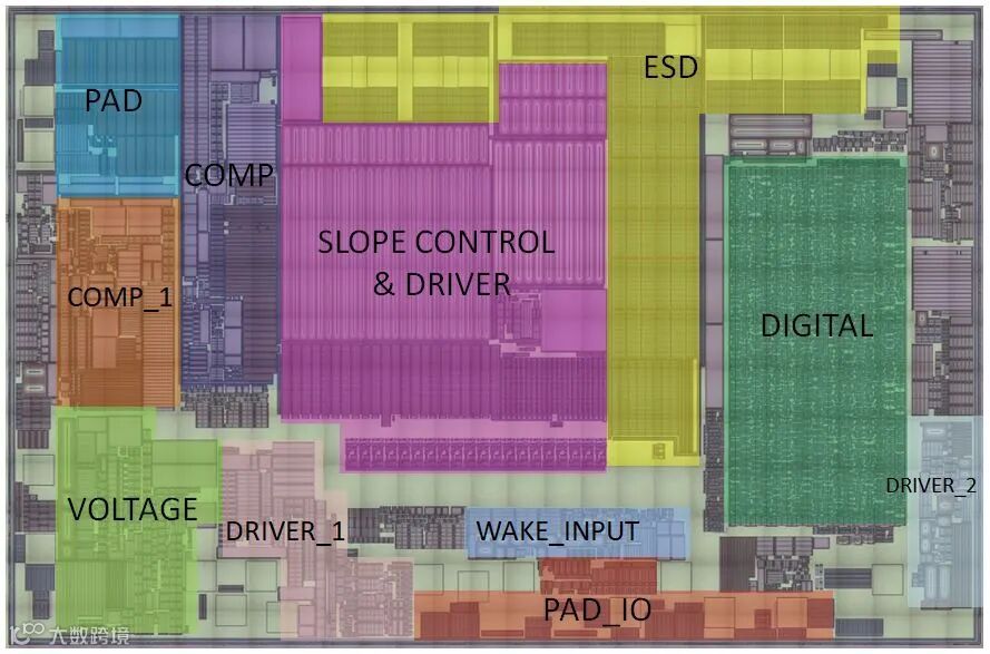 TJA1043芯片为COMS 500nm工艺,管芯面积为2.46x1.61mm²,有3层金属布线,下图为该芯片的概貌图。
