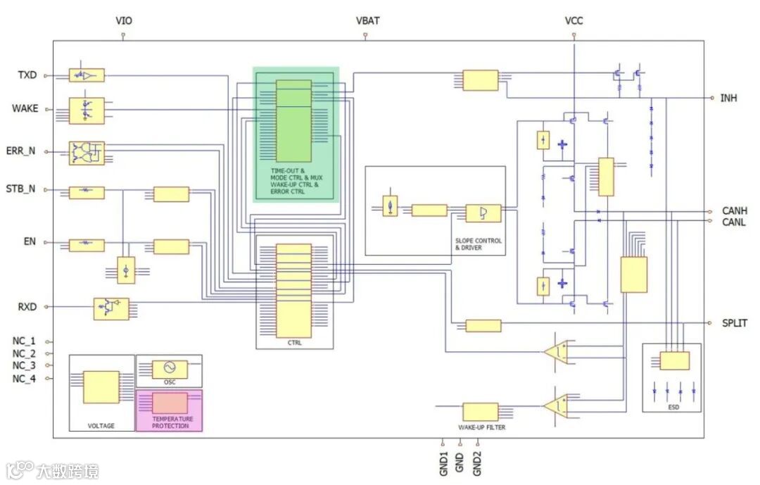 从电路图我们可以看到该芯片配备了多个诊断功能模块,如发送数据(TXD)主导的超时检测电路、TXD到RXD短路检测电路以及总线短路检测、超温检测等电路,这些电路能够实时监测芯片的工作状态和各种故障情况。