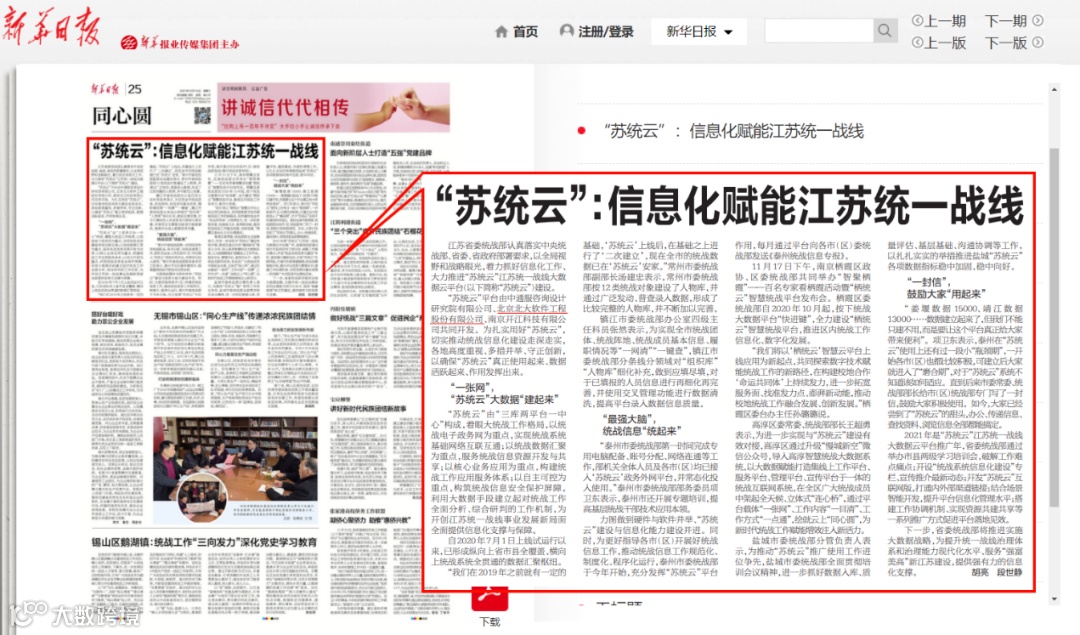 2021年12月15日,新华日报电子报第25版报道《信息化“苏统云”:赋能江苏统一战线》,江苏省委统战部认真落实中央统战部、省委、省政府部署要求,着眼大统战工作格局,开创统一战线事业发展新局面,规划并建设江苏统一战线大数据云平台(以下简称“苏统云”),北大软件参与此次建设任务。