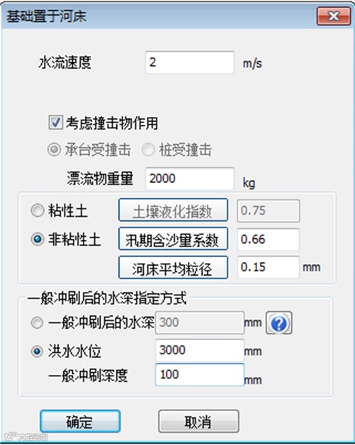 ▲基础置于河床时,按新规范公式计算局部冲刷度、流水动压力以及撞击物的计算,分为粘性土和非粘性土。