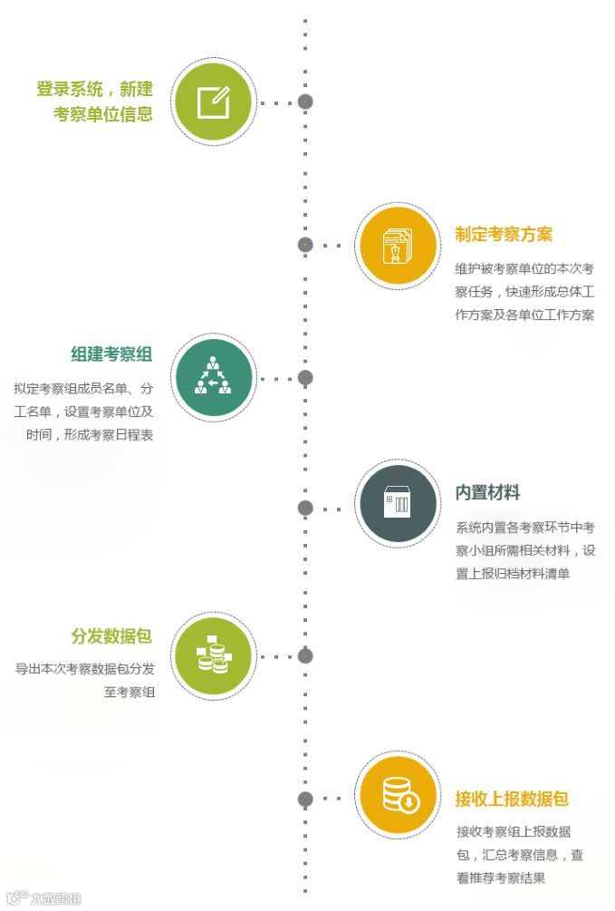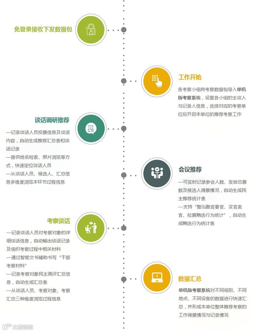 干部处(科)室采用网络版,定制流程及材料模板,形成考察数据包,接收上报数据包,汇总考察材料;考察组采用单机版,接收干部处室下发的考察数据包,到考察单位进行实地考察,形成上报数据包。