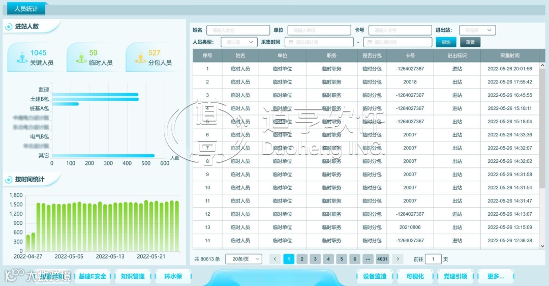 基于人脸生物识别技术、物联网技术、地理位置等技术,有针对性地结合基建工程的用工特点,以人车自动感应门禁、室外定位(基于蓝牙、北斗、UWB人员定位)等形式,实现人员实名制管理,为相关人员管理提供实名认证和信息互通服务,规范劳动用工管理。