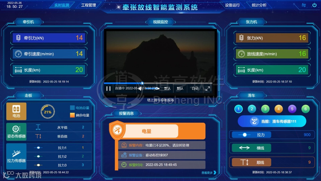 将滑车状态(拉力和倾角监测)、牵引板状态(位置、子导线拉力、姿态)、视频监控(跨越档全景、牵张视频)等信息传送至地面控制中心,依靠集控张力放线设备、低功耗广域物联网组网设备、可视化监控设备等核心组件,利用自组网技术结合传统张力放线工艺,实现张力放线设备集中控制和牵引场、张力场视频信号同步,完成放线全过程可视化施工,使作业操作员及时掌握整个牵张施工过程,提高线路牵张放线作业施工的安全性。