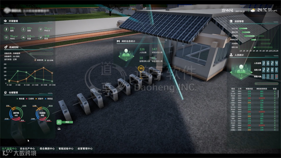 道亨基建现场智慧管控平台以BIM三维可视化、物联感知、虚拟仿真等技术为基础,主要采用“Web端+移动端+大屏展示端”的展现方式,汇聚各类施工数据信息,构建工地现场全息模型。