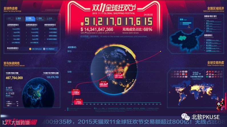 不知道大家对2015年在水立方双十一媒体中心的可视化大屏有没有印象,那是大屏展示第一次被人们所知,当时立起了一块宽21米,高10米的LED大屏进行全球同步直播。大屏幕分为三大板块,分别是总览大屏、全球大屏和城市大屏。每一个大屏幕都有自己的主题,总览大屏保留了2014年基本的信息点,全球屏是对于2015年“全球狂欢”这一主题的数据展示,而城市大屏是当年在信息点上的一大创新。