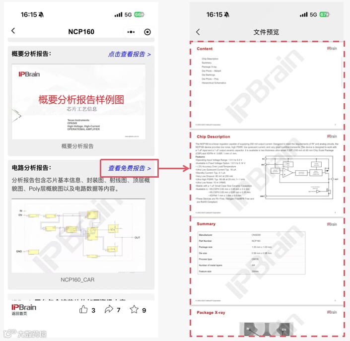 本期是平台君和您分享的第351期内容在这个收获的季节,平台君满怀感恩的心情,向一直以来支持IPBrain企业账号的每一位用户致以最诚挚的感谢。自业务上线以来,各位看官与平台君共同见证了业务的成长与壮大,从零星频道到如今的多样化内容,尤其在小程序上线后,日均用户活跃度显著提升,越来越多的工程师朋友通过这个平台获取到了精准、及时的产品资讯,平台君的每一步成长都离不开各位看官的支持与陪伴!本期内容,通过介绍LDO频道带领各位看官深入了解一下小程序平台目前的变化:LDO频道,即低压差线性稳压器频道,兼具简单经济、低压差、低噪声、结构简洁的特点,能为电子设备输出稳定直流电源,精准满足精密模拟系统供电及电池续航延长的核心需求。 选品主要来自海外知名大厂,例如TI、ADI等,并且频道内产品均已包含高清概貌图、工艺信息卡、功能模块布局图及概要分析报告,加入IPBrain小程序企业账号的看官可以通过积分兑换完成线上即时兑换。以NCP160👈为例,进入小程序后,通过搜索栏进行型号搜索,可以进入NCP0160的详情页,并通过产品型号下方的标志来判断该产品的频道类型:(图源:IPBrain小程序)NCP160作为一款线性稳压器,能够提供 250 mA 输出电流。NCP160 器件专用于满足射频和模拟电路要求,提供了低噪声、高 PSRR、低静止电流和非常好的负载/线路瞬变。该器件设计使用 1 µF 输入和 1 µF 输出陶瓷电容器。它拥有两种不同厚度的封装,分别为超小 0.35P,0.64 mm x 0.64 mm 芯片级封装 (CSP),XDFN−4 0.65P,1 mm x 1 mm 封装,在射频(RF)和模拟电路等领域展现出独特优势。以下是其工艺信息卡:让我们再回顾一下它的模块布局吧!如果是已经加入企业账号的看官,可以通过积分兑换,立刻在设备上解锁查看。模块布局图(图源:IPBrain平台)该产品目前提供免费报告,给各位看官们直接的特权享受。同样地,如果是已经加入企业账号的看官,可以通过积分兑换,立刻在设备上解锁查看:(图源:IPBrain小程序)(图源:IPBrain小程序)为了让大家能更好地使用频道,平台君在此简要介绍查看频道内容的方法:1. 访问IPBrain平台,通过绑定企业账号,进入企业账号主页2. 点击页面下方频道,即可查看解锁频道,并浏览产品型号;同时,也可在搜索框中输入您感兴趣的型号(如“NCP160”),通过型号下面标志确认所在频道3. 通过积分兑换,查看详细信息,包括高清概貌图、工艺信息卡、功能模块布局图及评估报告等信息平台君也希望大家多提宝贵意见,帮助我们不断优化和完善LDO频道的内容与服务,为大家提供更全面、更精准、更及时的技术信息支持。
