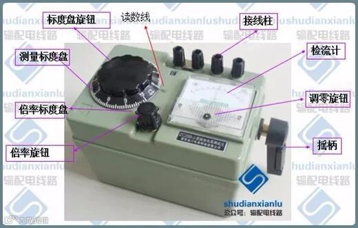 测量盘旋钮 —— 用于测试中调节旋钮:使检流计指针指于中心线。