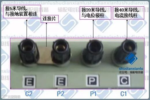 测试线连接地阻表时,长线接C1,短线接P1,5米引线接C2、P2,与拆卸完接地引下线并打磨后的接地装置相连接。