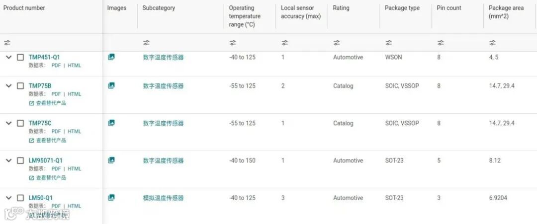 下图是TI同系列数字温度传感器产品: